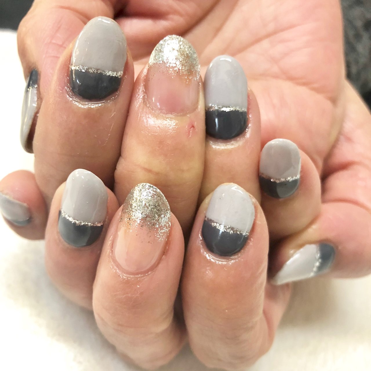 グレーの ツートーンネイル 最近ピンク色ばっかりだったな と思ってグレーに Ducato の コンデンスミルク と Shhh の組み合わせかわいい 乾きが遅いのがちょっとね ネイル セルフネイル Selfnails グレーネイル ツートーンネイル ネイル